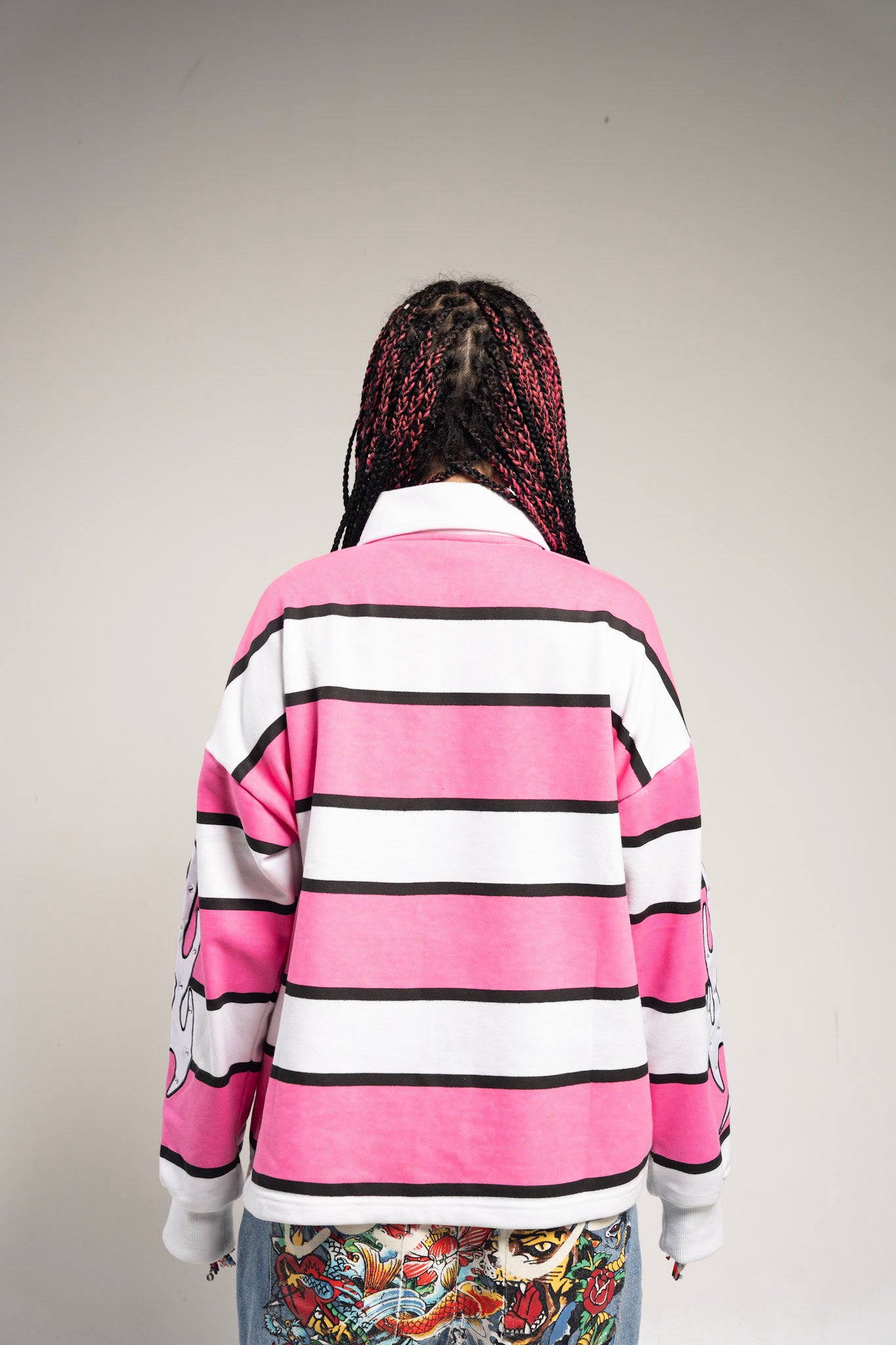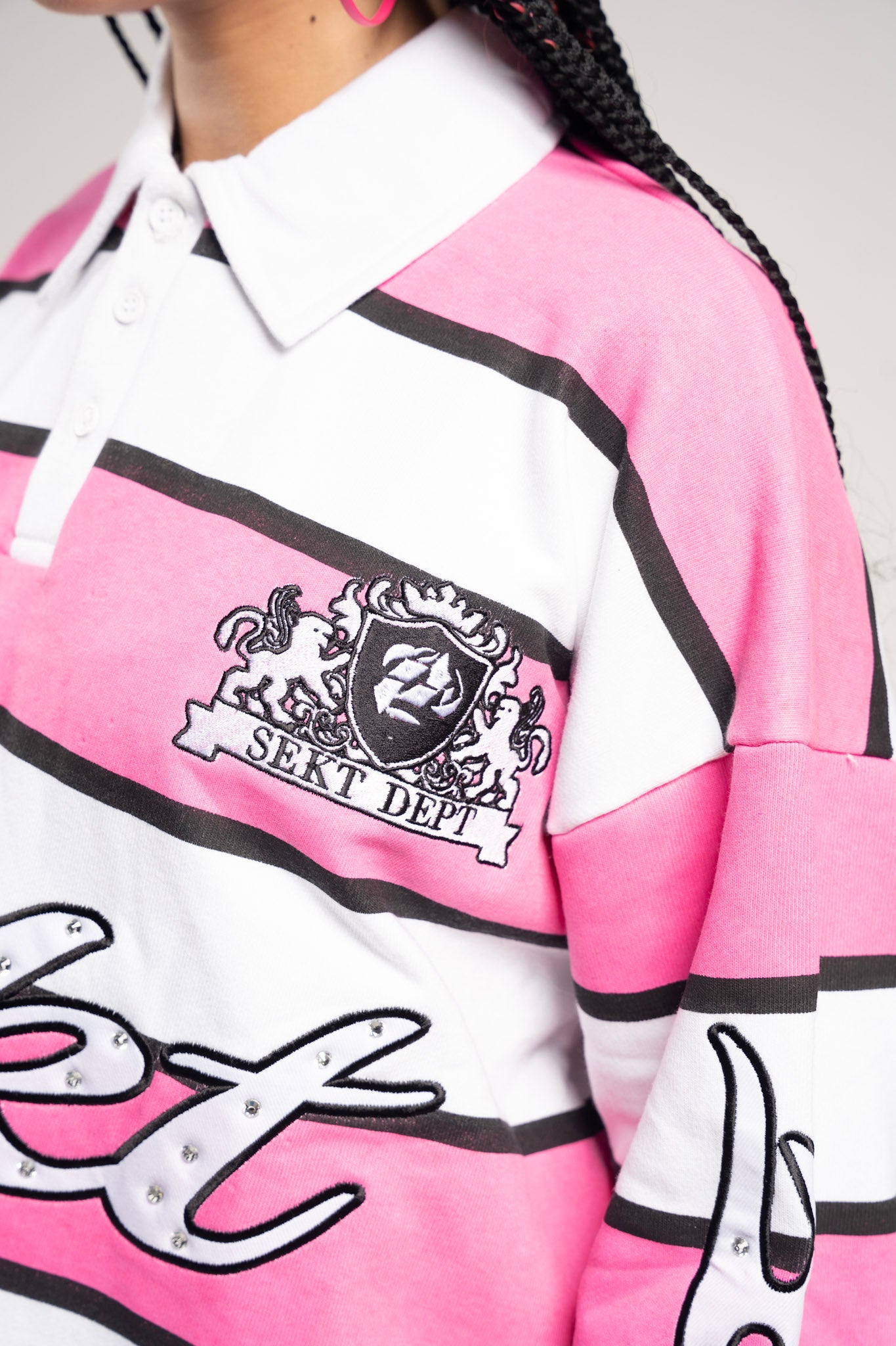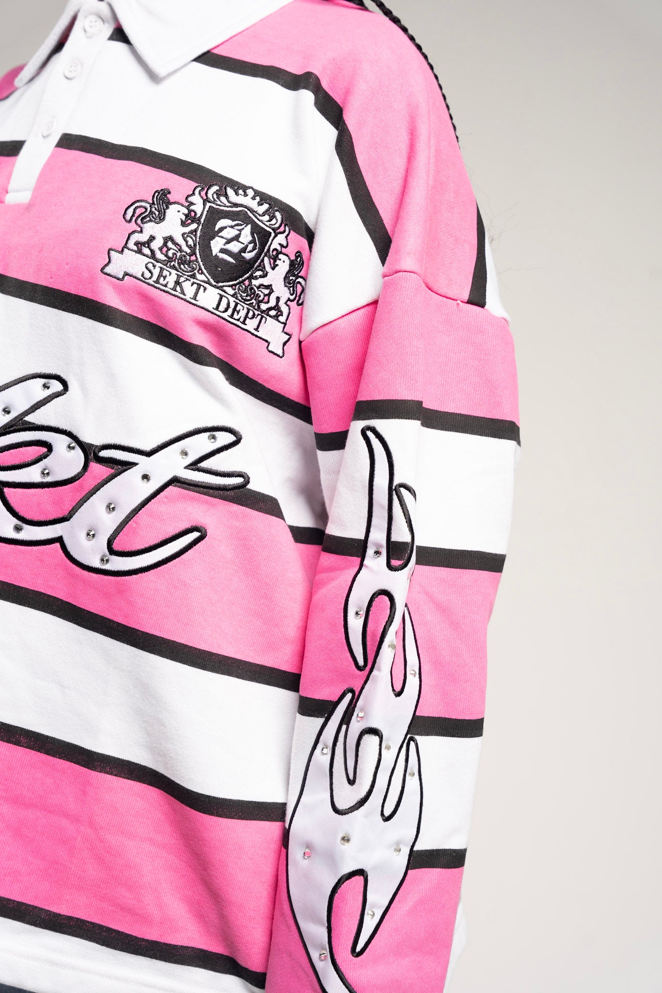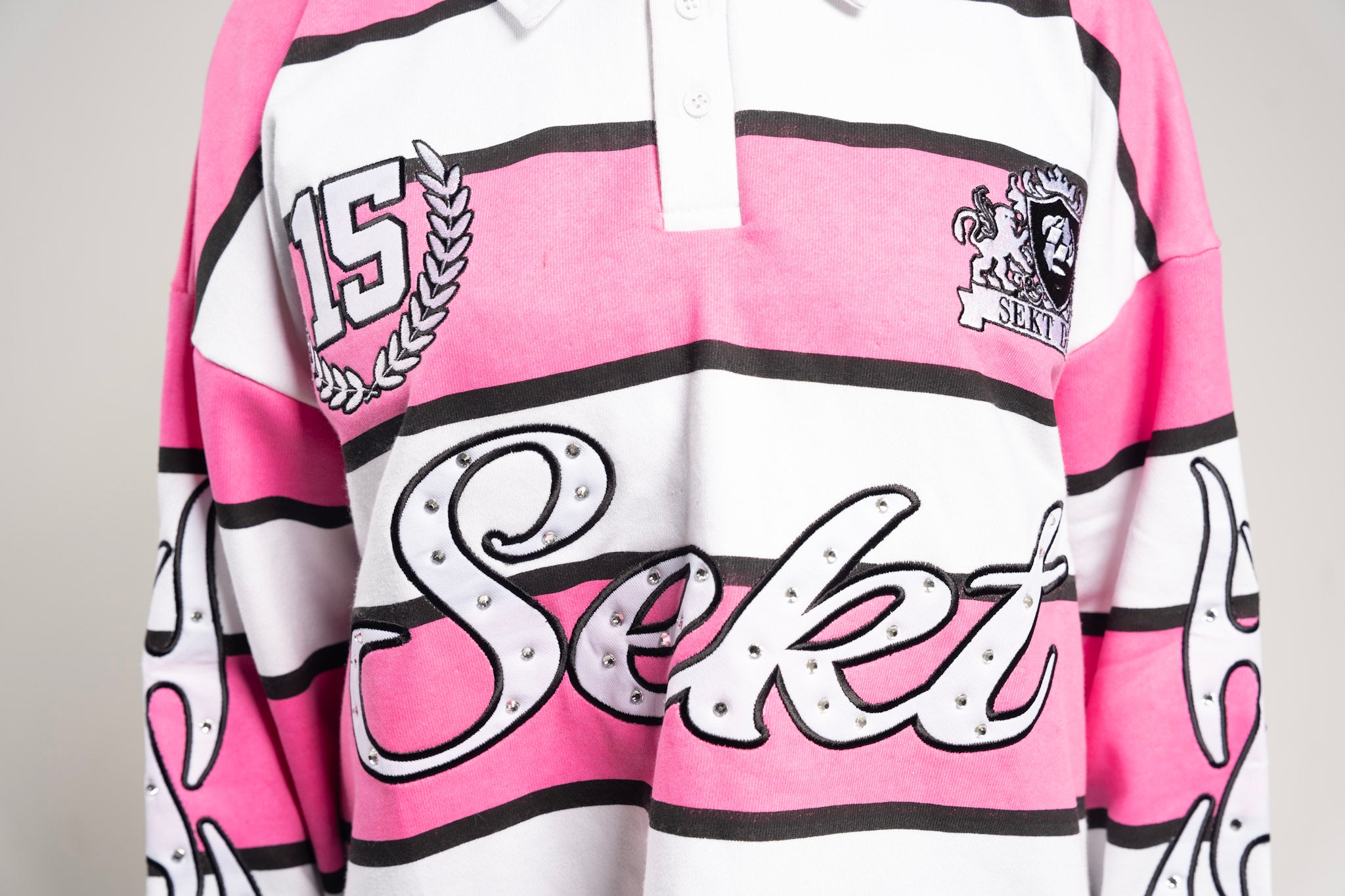 An elevated take on the classic rugby — built heavy, iced-out with rhinestones, and finished with SEKT’s signature oversized silhouette. Structured like a uniform, worn like armor — this piece blurs the line between sport and sanctity. Each stitch and embellishment stands as a symbol of rebellion refined.