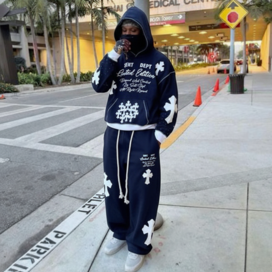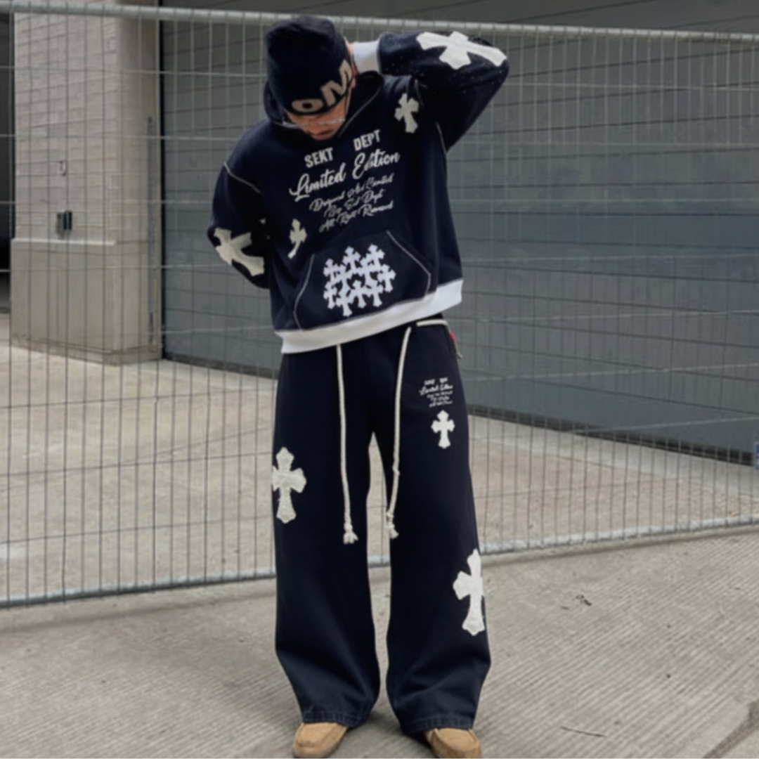 Saint Hoodie blends militant structure with divine luxury. Crafted from heavyweight cotton fleece, detailed with SEKT’s signature cross appliqués, and hand-finished with scattered rhinestones.