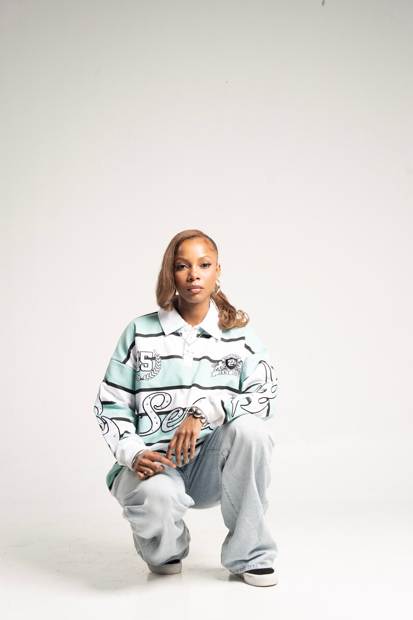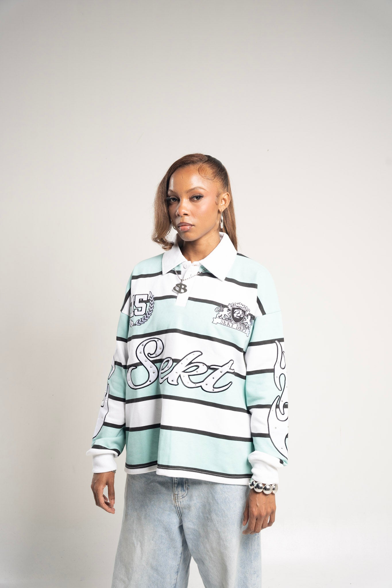 An elevated take on the classic rugby — built heavy, iced-out with rhinestones, and finished with SEKT’s signature oversized silhouette. Structured like a uniform, worn like armor — this piece blurs the line between sport and sanctity. Each stitch and embellishment stands as a symbol of rebellion refined.